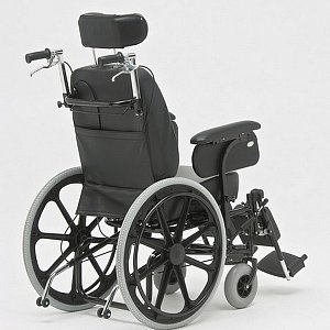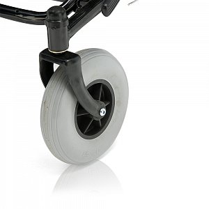 - Кресло-коляска оснащена колесами, имеющими пневматические задние и передние цельнолитые шины.