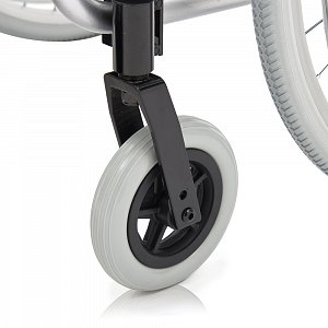 - Кресло-коляска оснащена колесами, имеющими пневматические или цельнолитые задние и передние цельнолитые шины.