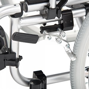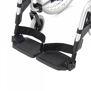 - Кресло-коляска оснащена съемными, поворотными подножками, регулируемыми по высоте с мягким упором для голени.