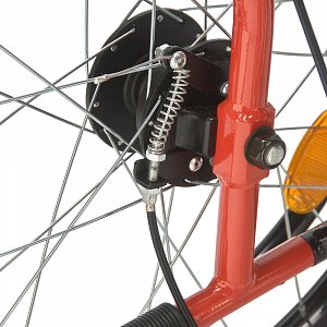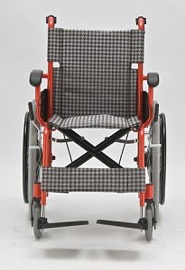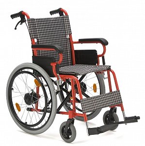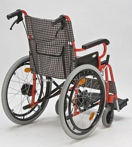 - Кресло-коляска оснащена колесами, имеющими задние пневматические и передние цельнолитые шины.