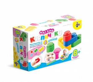 В комплект входят 6 разноцветных элементов конструктора из полимера, приятного на ощупь.