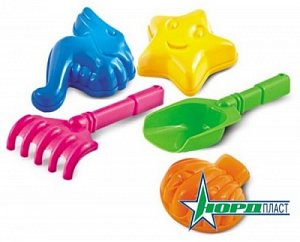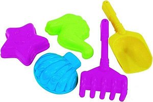 Универсальный набор для песка состоит из пяти разноцветных предметов трех формочек для лепки (звезда, ракушка, рыбка), совочка и грабелек.