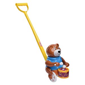 - Во время движения каталки симпатичный мишка начинает стучать палочками по барабану. Чем быстрее будет бегать ваш малыш, тем активнее мишка будет настукивать свои ритмы и сучить толстыми ножками.