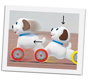 - Для того чтобы запустить механизм движения, необходимо нажать на голову собачки и она покатится вперёд, набирая скорость;
