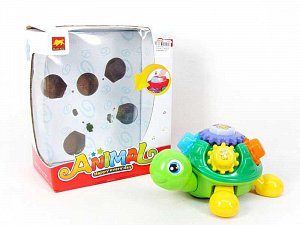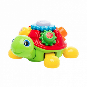 Яркая игрушка в виде забавной черепашки предназначена для самых маленьких. Она может шевелить лапами, хвостом, головой и передвигаться по ровной поверхности самостоятельно. При нажатии на музыкальную кнопку ребенок услышит 2 веселые песенки и стихотворение Агнии Барто. Шестеренки на панцире можно крутить. Игрушка выполнена из яркого качественного пластика и оснащена световыми эффектами. Она подарит вашему малышу массу положительных эмоций. Черепашка упакована в картонную коробку с окном.