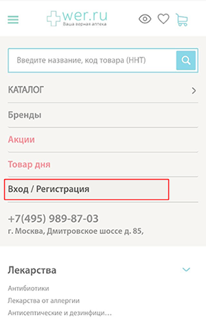 - Чтобы авторизоваться или зарегистрироваться в системе, кликните по строке "Вход / Регистрация" в меню под поиском.