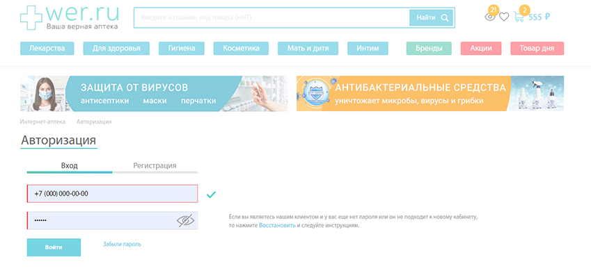 - Чтобы авторизоваться или зарегистрироваться в системе, кликните по ссылке "Вход / Регистрация" справа над поисковой строкой.
