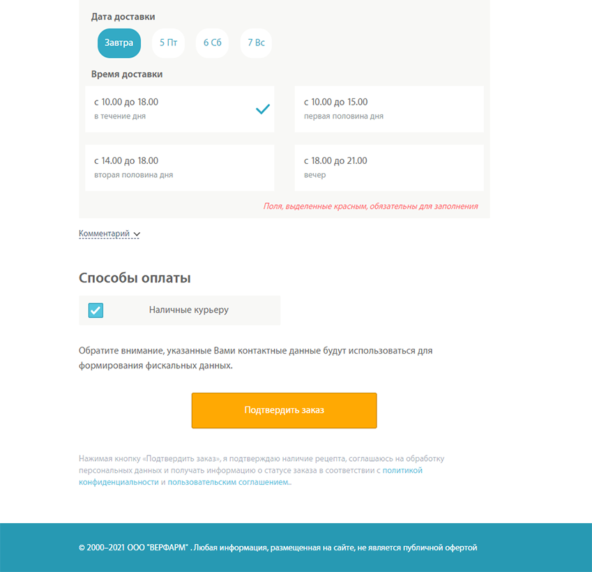 - Кроме того, для курьерской доставки есть возможность выбирать разные временные интервалы. Для завершения оформления нажмите кнопку "Подтвердить заказ".