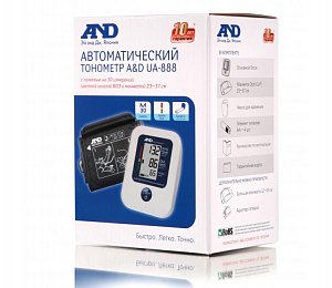 Достоинством этой модели тонометра является также управление одной кнопкой, прибор также обладает функцией выявления аритмии. Автоматический современный тонометр AND UА-888 снабжен большим дисплеем, шкалой измерения давления ВОЗ, он способен запоминать до 30 измерений и производить при необходимости расчет среднего давления. Русифицированный текст, нанесенный на сам прибор и манжету, облегчает его использование.