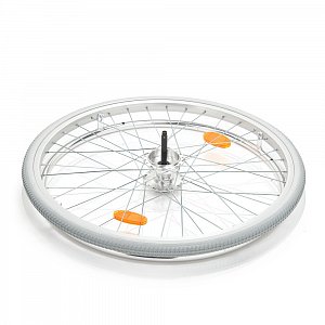 - Кресло-коляска оснащена колесами, имеющими пневматические или цельнолитые задние и передние цельнолитые шины.