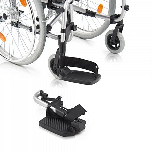 - Кресло-коляска оснащена съемными, поворотными подножками, регулируемыми по высоте с мягким упором для голени.