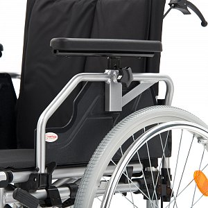 - Кресло-коляска оснащена несъемными, откидными, регулируемыми по высоте подлокотниками.