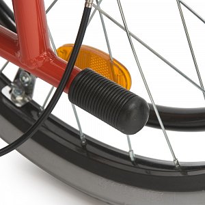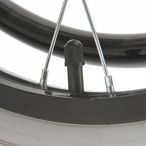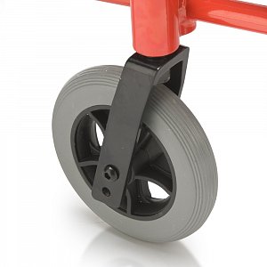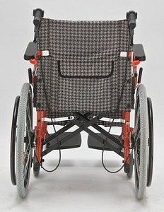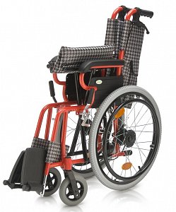 - Кресло-коляска оснащена колесами, имеющими задние пневматические и передние цельнолитые шины.