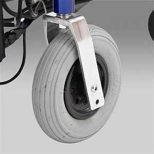 - Кресло-коляска оснащена колесами, имеющими задние пневматические и передние цельнолитые шины.