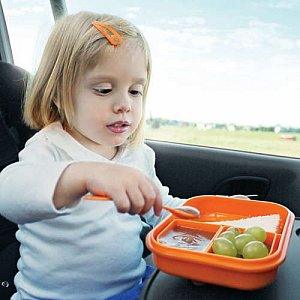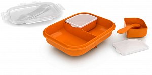 Набор состоит из большого контейнера с делением на два сегмента, двух съемных малых контейнеров с крышками для закусок или небольших порций, ложечки для кормления и нескользящего подноса, предотвращающего проливание.