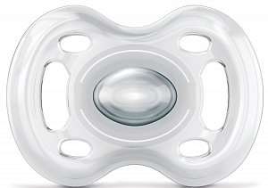 Симметричная мягкая соска пустышки учитывает естественное строение и развитие неба, зубов и десен младенца.