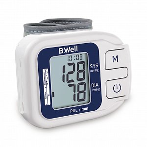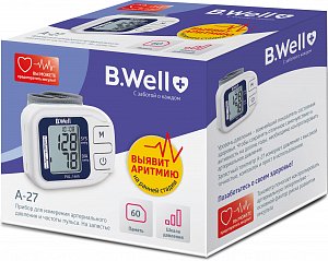 Запястный тонометр B.Well A-27 – классический тонометр с манжетой на запястье. Расширенные функции и большой дисплей заключены в элегантном корпусе. Тонометр измеряет давление с высокой точностью, имеет индикатор аритмии, а также память на 60 измерений с отметкой даты и времени. Специальная шкала уровня давления позволит оценить полученный результат: нормальное артериальное давление, либо гипертония 1, 2 и 3 степени.