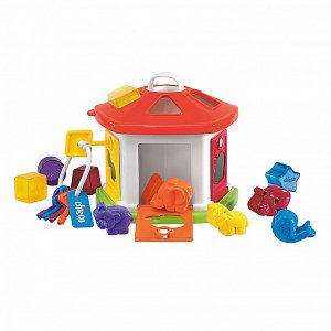 "Домик для животных" предназначен для малышей старше года. Небольшой дом, в котором живут 5 животных, с дверями для каждого из них (имеют соответствующие слоты). Геометрические фигуры и фигурки животных должны быть собраны внутрь домика в соответствии с формой и цветом. Каждой дверце соответствует свой ключ, а основной ключ открывает все дверцы. Разнообразная и увлекательная игра, которая развивает координацию движений, логическое мышление, а так же учит распознавать формы и цвета.