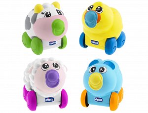 Коллекция GoGo Music - четыре маленьких забавных зверька из пластика (корова, овечка, кролик, уточка) удобно ложатся в руку, форма способствует оттачиванию первых движений ребенка. Разблокировав колесики игрушки, просто подтолкните ее и вы услышите приятную мелодию и звуки.Доставка