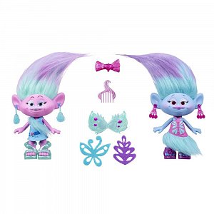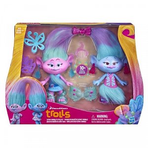 Игровой набор DreamWorks "Модные близнецы" из серии "Тролли" от Hasbro включает в себя 2 небольшие - каждая ростом около 23 см - фигурки. Несмотря на разный цвет кожи - у одной голубой, у второй розовый, - они очень похожи. В комплекте с ними идет целый ряд аксессуаров. В их числе присутствует и маленький гребешок, при помощи которого можно будет расчесывать густые цветастые волосы троллей. Кроме того, в комплекте имеются серьги, миниатюрные очки и даже заколка для волос, позволяющая скрепить прически модных близнецов вместе.