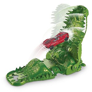 Установив старт напротив раскрытой челюсти зеленого чудовища, ребенок сможет запустить машинку, пытаясь проскользнуть мимо крокодила. В случае неудачи пасть хищника захлопнется вместе с машинкой.