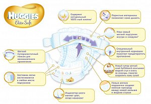 Подгузники Huggies Elite Soft (Хаггис Элит Софт) для новорожденных содержат "дышащие" материалы, не вызывают опрелостей и раздражения, не натирают, моментально впитывают влагу, помогая сохранить кожу сухой, застежки-липучки застегиваются в любом месте подгузника. Подходят для мальчиков и девочек.