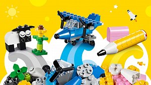 Бесконечные возможности для сборки из классических кубиков 29 разных цветов и специальных деталей, включая двери, окна, колеса, глаза, пропеллеры и отделитель кубиков.