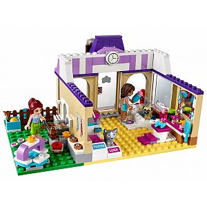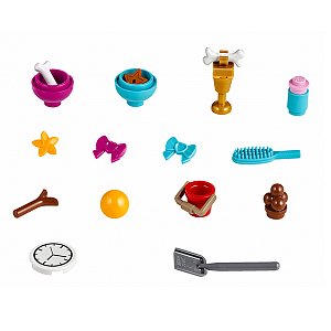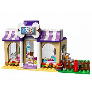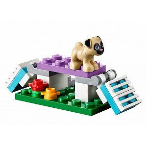 Из деталей набора вы можете собрать большой комплекс для собачек, включающий в себя игровую площадку, зону для груминга и зону для выгула. Пройдя через стеклянную дверь с надписью «Открыто» в центре здания, Вы попадаете в салон красоты для щеночков. Здесь Вы можете искупать Вашего питомца, причесать шерстку, украсить любимца нарядным бантиком. Также предусмотрено место для кормления и отдыха щенков и офисная зона. Из груминг-салона Вы попадаете на огороженный задний двор для выгула малышей. Там Вы найдете поводки, рукомойник, поилку с водой и разнообразные игрушки. Не забудьте убрать за любимым питомцем при помощи совка и ведра.