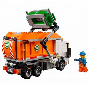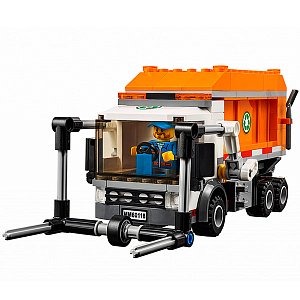 Чтобы навести порядок на городских улицах, Вам понадобится бригада рабочих и мощный мусоровоз из набора Лего 60118. Его ходовая часть представлена усиленной подвеской и тремя парами колёс. Массивная кабина, выполненная из деталей белого цвета, имеет множество реалистичных элементов, таких как сигнальные огни, большое лобовое стекло, боковые зеркала, радиаторная решётка, фары и автомобильный номер. Съёмная крыша позволяет заглянуть в салон и изучить его интерьер. За кабиной предусмотрены крепления для подъёмника, напоминающего вилы. Его главной задачей является фиксация мусорных контейнеров и высыпание их содержимого прямо в оранжевый кузов грузовика. Если во время опрокидывания контейнера что-то упало мимо, то рабочие подметут асфальт, используя метлу и совковую лопату. Вместимость кузова мусоровоза достаточно велика, что позволяет объехать сразу несколько кварталов. Когда уборка завершена, бригада отправляется к мусоросжигательному заводу. Здесь грузовик останавливается и медленно поднимает свой кузов. Через откидывающиеся задние стенки мусор высыпается наружу и ждёт дальнейшей переработки.