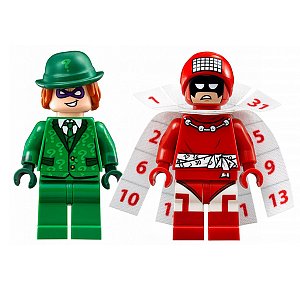 - На его минифигурку надет плащ и воротник в виде календаря, а на голове красный шлем.