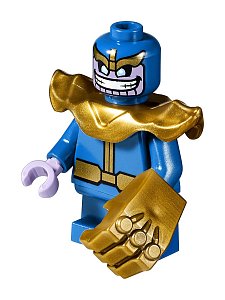 - На плечах его минифигурки надеты наплечники, а на руку - перчатка неуязвимости.