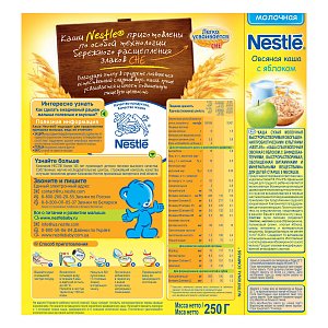 Молочная овсяная каша Nestle с яблоком приготовлена с использованием особой технологии бережного расщепления злаков СНЕ. Благодаря этому в продукте появляется естественный сладкий вкус, каша лучше усваивается и имеет повышенную пищевую ценность. Каша является полезным сбалансированным прикормом для здоровых детей. Яблоко способствует развитию вкусовых восприятий малыша. Каша обогащена витаминами и микроэлементами, содержит пробиотики - живые бифидобактерии комплекса BL. Они способствуют нормализации пищеварения, росту здоровой микрофлоры и укреплению иммунитета, что очень важно в период введения прикорма.