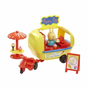 Замечательный игровой набор от бренда Peppa Pig, оформленный по мотивам популярного мультипликационного сериала "Свинка Пеппа", непременно понравится вашему ребенку. Каждый раз малыш сможет придумывать разные истории, представляя себя продавцом кафе. Комплект включает кафе-фургон для перевозки мороженого, мопед, фигурку кролика Ребекки с подвижными ручками и ножками, а также дополнительные аксессуары. С мопедом можно играть отдельно, отсоединив от будки.