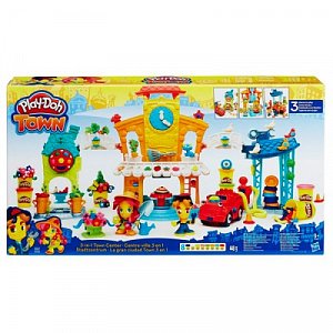 Серия игрушек Play-Doh Town объединяет в себе традиционную лепку из пластилина и наборы фигурок людей, животных, составные части городских зданий и различного городского транспорта. Из элементов этого набора Вы можете построить городскую площадь с ратушей с часами и фонтаном, украсить их цветами и птицами.