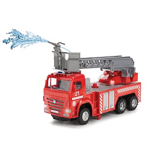 Пожарная машина "Камаз" может брызгать водой и тушить игрушечные пожары. Этой и другими функциями можно управлять при помощи дистанционного пульта. Камаз ездит назад, вперед, а также влево и вправо. Выдвижную лестницу можно поднимать и опускать, а на ее конце располагается корзина, в которую вполне поместится небольшая фигурка пожарника. Кроме того, у машинки есть световые эффекты: загорается сирена и мигают фары. Нажав соответствующую кнопку на пульте управления, можно включить звук мотора или сирены, а также озвученные фразы.