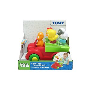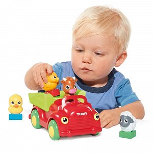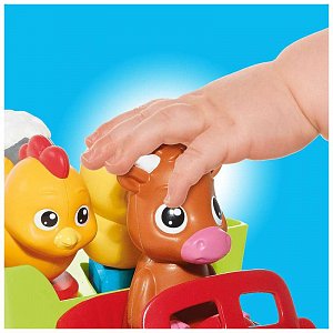 Сортер "Весёлая ферма"- это забавная игрушка для малышей в виде грузовичка с домашними животными. За рулем сидит теленок, в кузове едут утенок, цыпленок и овечка. Кузов грузовичка представляет собой сортер с отверстиями разной формы, к которым подходят подставки фигурок. Если ребенок все сделает правильно - каждое животное издаст характерный для него звук.