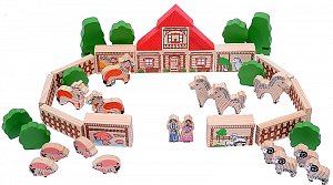 Ребенок весело проведет время, играя в конструктор и развивая свое воображение, координацию движений, концентрацию внимания и логическое мышление, научится различать цвета и формы. Игровой набор изготовлен из натурального дерева, обладает приятным древесным запахом, который оказывает благоприятное воздействие на эмоциональное состояние ребенка. Деревянные фигурки приятно держать в руках. Многочисленные предметы, входящие в состав набора, помогут развить фантазию ребенка. Построив ферму, он будет придумывать разные сюжеты, распределяя роли по своему усмотрению.
