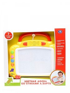 Цветная доска для рисования оснащена световыми и звуковыми эффектами. Поэтому процесс рисования будет максимально увлекательным и превратится в веселую игру. Стираются изображения буквально одним движением, словно по волшебству, для этого нужно просто потянуть за ручку. Озвучена доска профессиональными актерами, а значит, вы можете быть уверены, что ребенок запомнит правильное произношение. Нажимая на кнопки, ребенок услышит 4 стихотворения А. Барто, а также 3 песенки по стишкам того же автора.Возраст от 2 лет