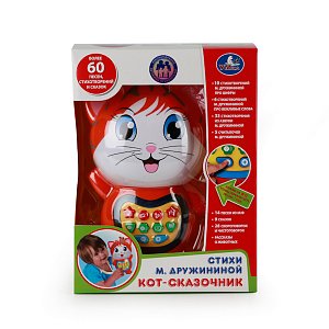 "Кот-сказочник" от компании "Умка" - это интерактивная игрушка, которая может излучать свет, а также воспроизводить звук. Этот игрушечный котик с многочисленными кнопками в районе живота сможет рассказать ребенку какую-нибудь сказку, для ее воспроизведения нужно лишь нажать на определенную кнопочку.